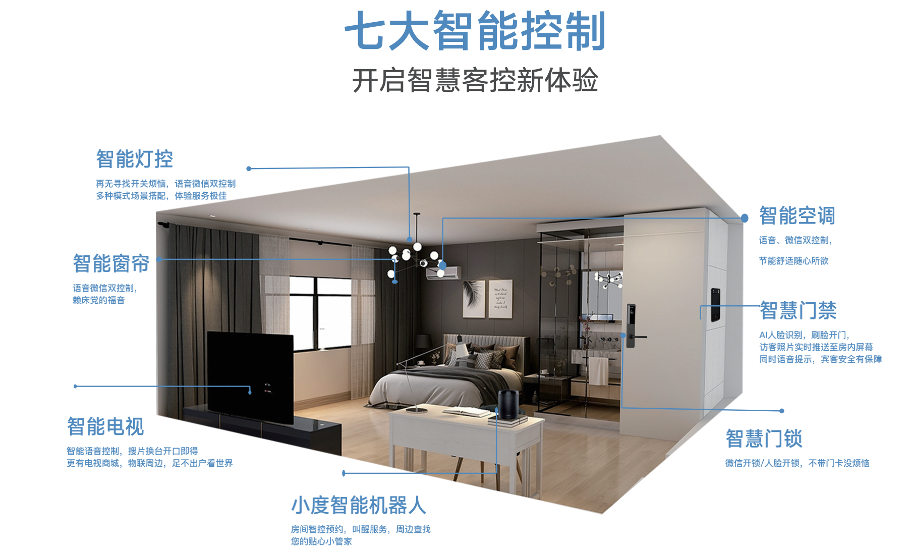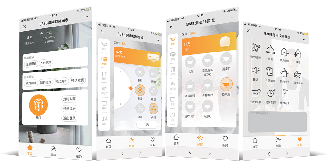 1、賓客可(kě)通(tōng)過微(wēi)信實現(xiàn)選房(fáng)、訂房(fáng)、開(kāi)鎖、控制(zhì)客房(fáng)設備、點餐、呼叫服務、續房(←fáng)和(hé)退房(fáng)等功能(néng)。